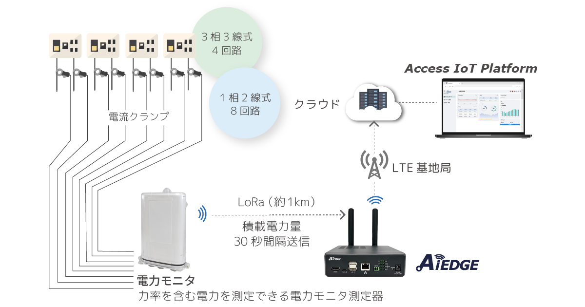 力率を含む電力を測定できる電力モニタ測定器です。積算電力データを LoRa通信に変換し、AiEDGEがクラウドへアップロードします。