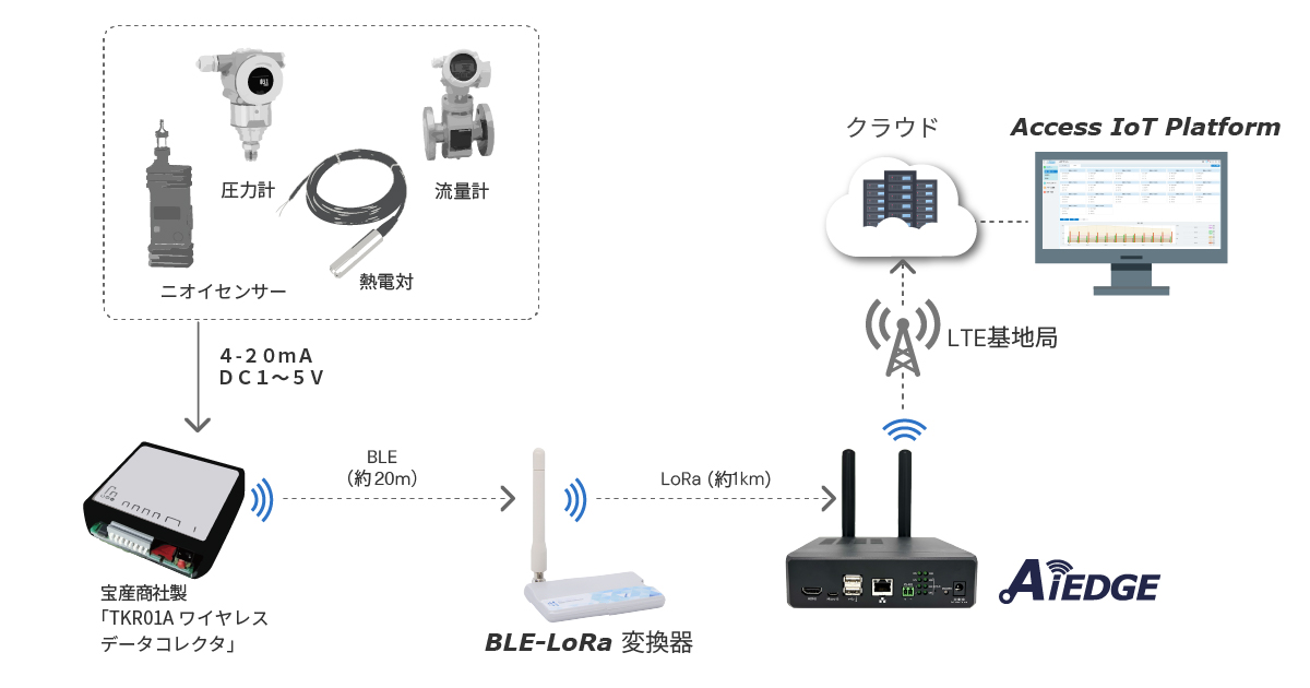 各種センサーが出力する 4–20mA のアナログ信号を宝産商(株)製「TKR01A ワイヤレスデータコレクタ」がBLE 無線に変換して送信。それを受信したBLE–LoRa変換器がLoRa無線に変換してAIEDGEに送信。LoRa無線を受信したAiEDGEはクラウドへデータをアップロードします。